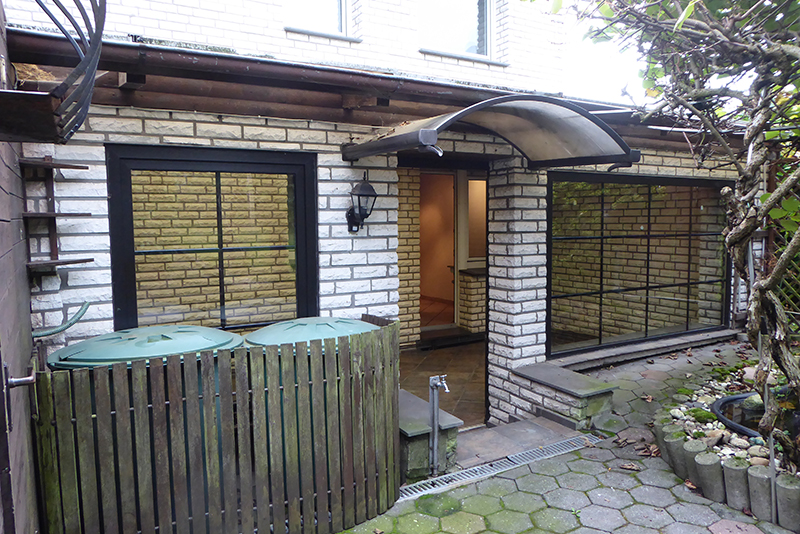 Im Erdgeschoss befinden sich das große Wohnzimmer mit Ausgang zur Südterrasse, ein Gäste-WC und die Küche mit Speisekammer. In Richtung hinterem Garten wurde ein überdachter Freisitz gebaut, der hier wie ein weiteres Zimmer genutzt wird.