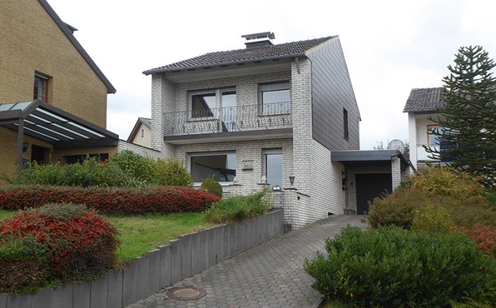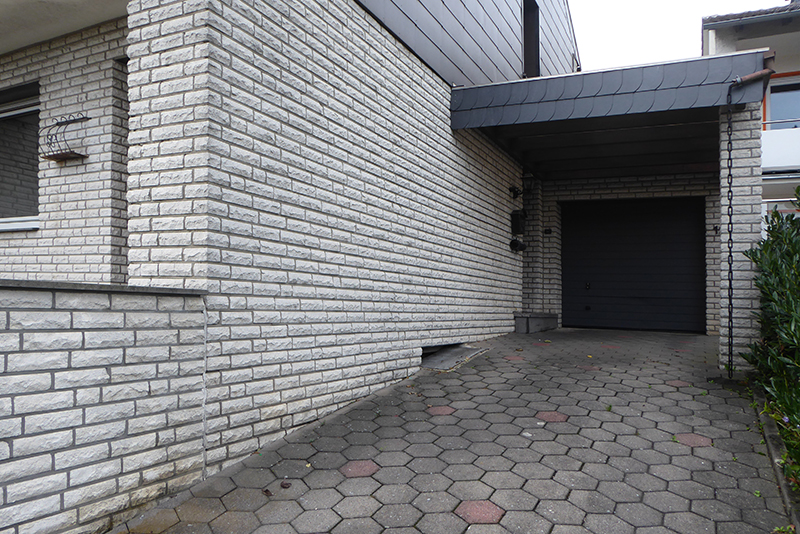Über die Einfahrt gelangt man hier zu der Garage und zum überdachten Hauseingang.
