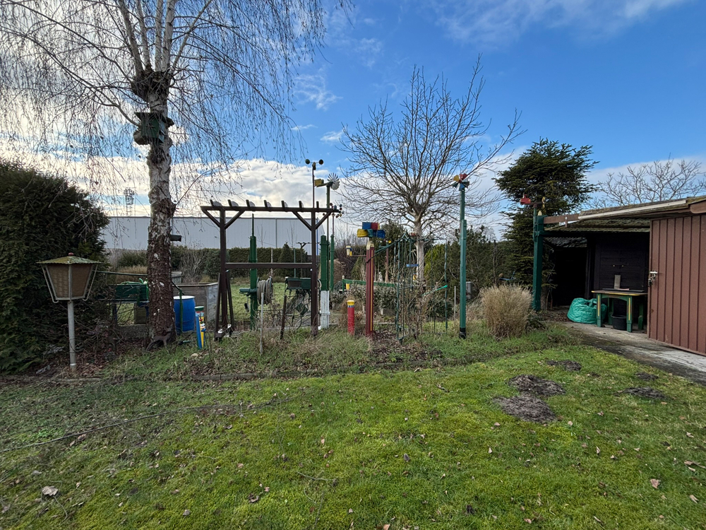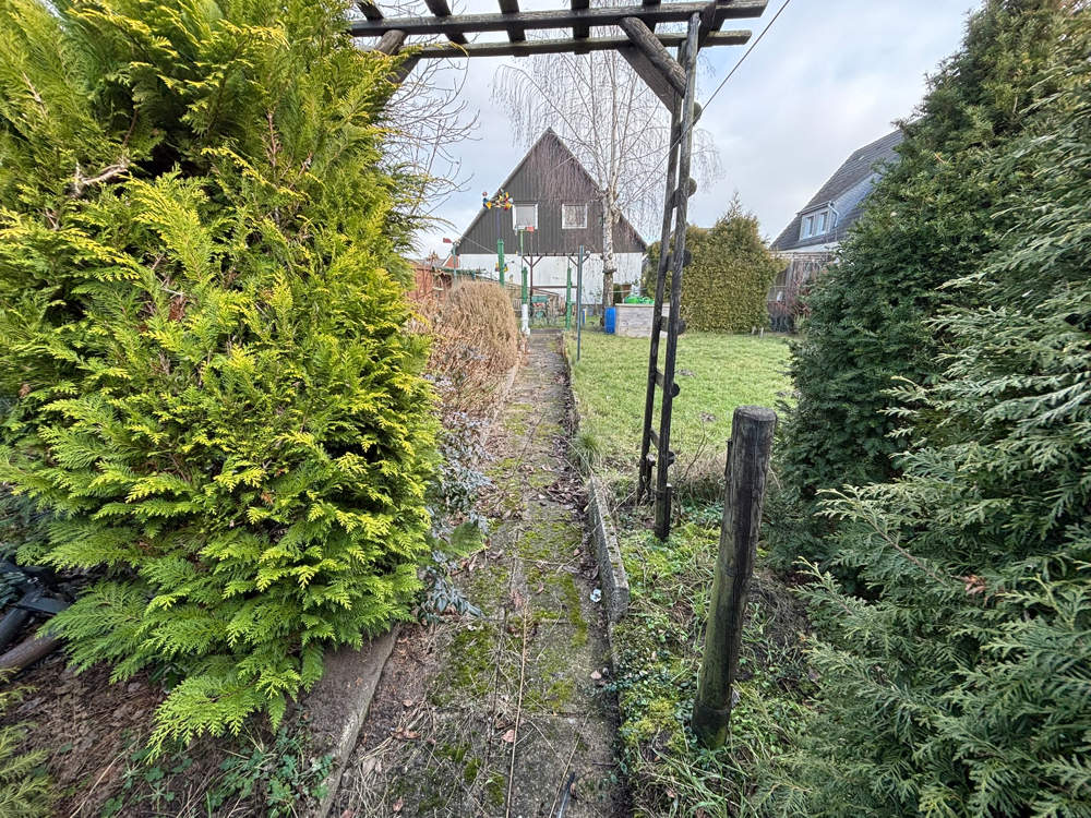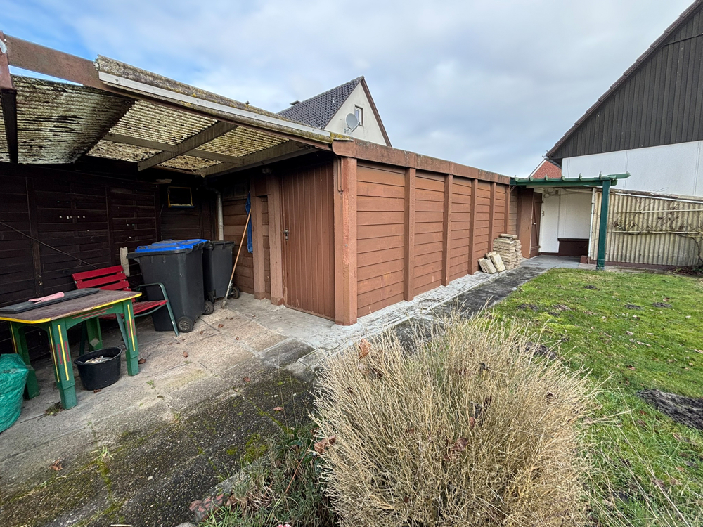 Zu der baulichen Anlage gehört eine Garage mit Abstellraum und überdachtem Freisitz und eine Gartenlaube.
