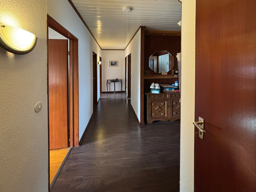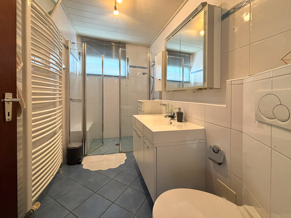 Im Erdgeschoss gibt es ein großes Wohnzimmer mit Ausgang zur Terrasse, eine Küche, ein Bad und zwei Schlafzimmer. Eines der vormaligen Kinderzimmer wurde zum Wohnzimmer hin geöffnet und bildet so einen offenen Eßbereich. Das modernisierte Bad hat eine bodengleiche Dusche.